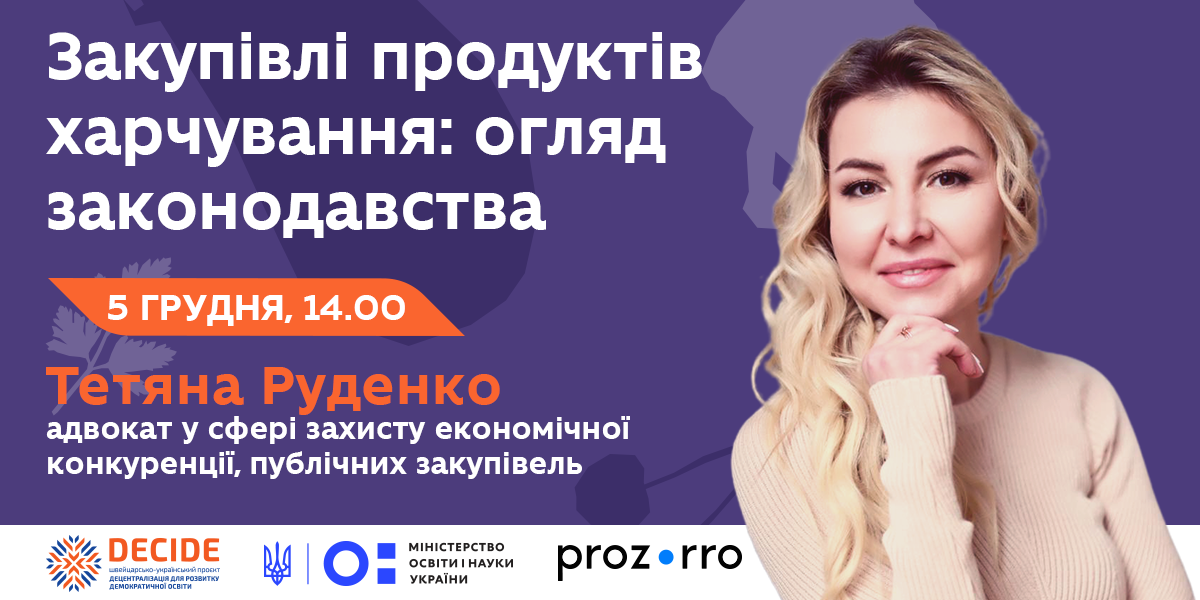 Так, на вебінарі із юристкою Тетяною Руденко обговоримо, як провести закупівлю продуктів харчування із поєднанням норм законодавства у сфері закупівель та законодавства про безпечність та якість харчових продуктів і врахувати специфіку закладів освіти.