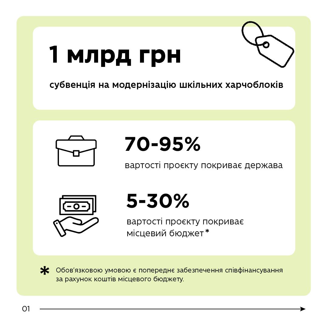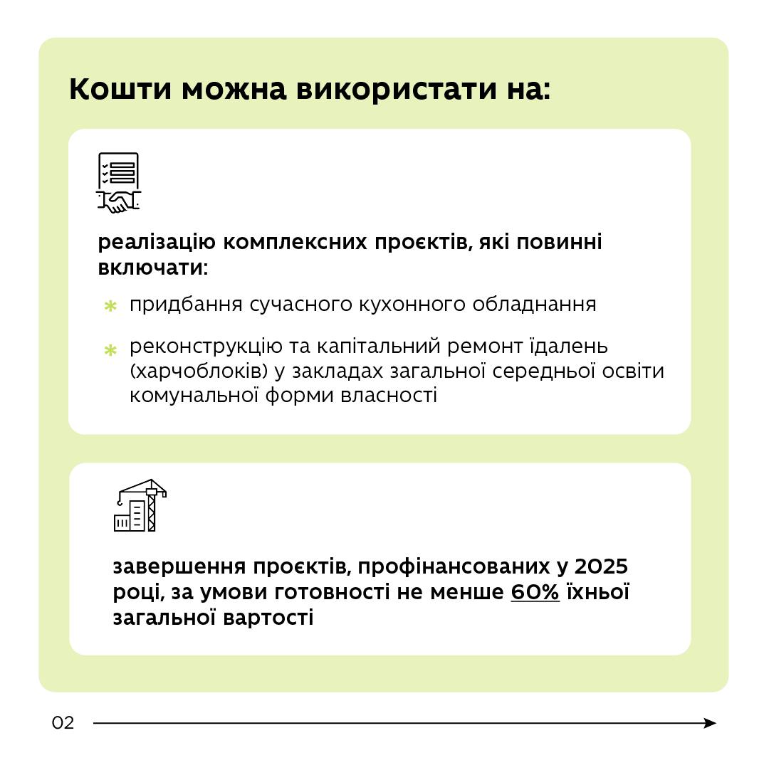 Субвенція спрямовуватиметься на реалізацію публічних інвестиційних проєктів, включених до галузевого проєктного портфеля держави, що відповідають програмі «Придбання обладнання, створення та модернізація їдалень (харчоблоків) закладів освіти». Кошти можна використати на: