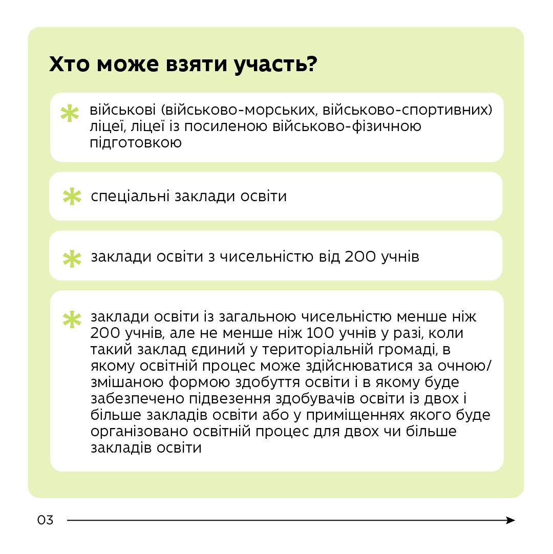 заклади освіти із загальною чисельністю менше ніж 200 учнів, але не менше ніж 100 учнів у разі, коли такий заклад єдиний у територіальній громаді, в якому освітній процес може здійснюватися за очною/змішаною формою здобуття освіти і в якому буде забезпечено підвезення здобувачів освіти із двох і більше закладів освіти або у приміщеннях якого буде організовано освітній процес для двох чи більше закладів освіти.