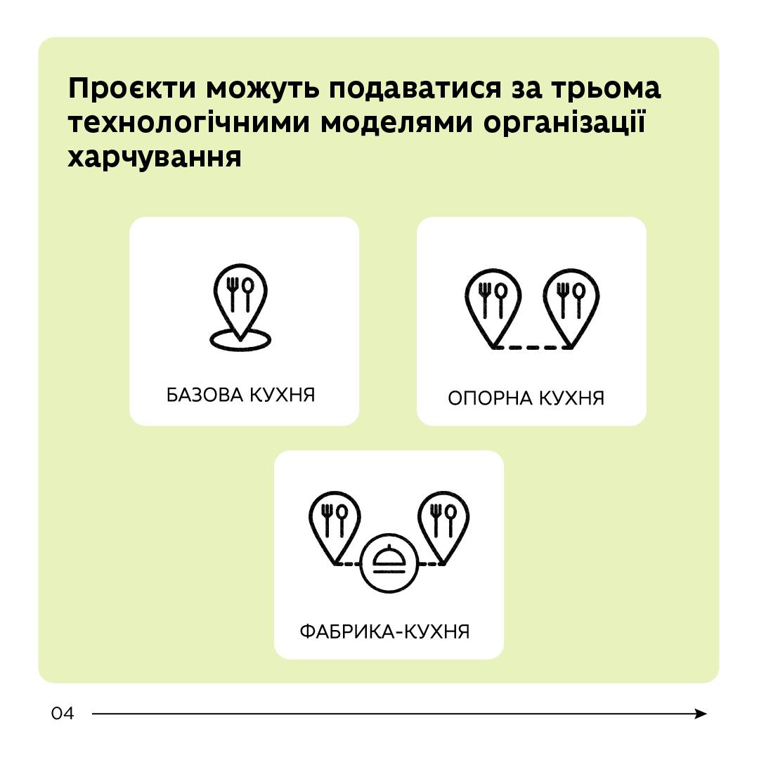 Проєкти можуть подаватися за трьома технологічними моделями організації харчування «базова кухня», «опорна кухня», «фабрика кухня». Також визначено вимоги до кожної з цих моделей, з урахуванням кількості учнів і типу громади.