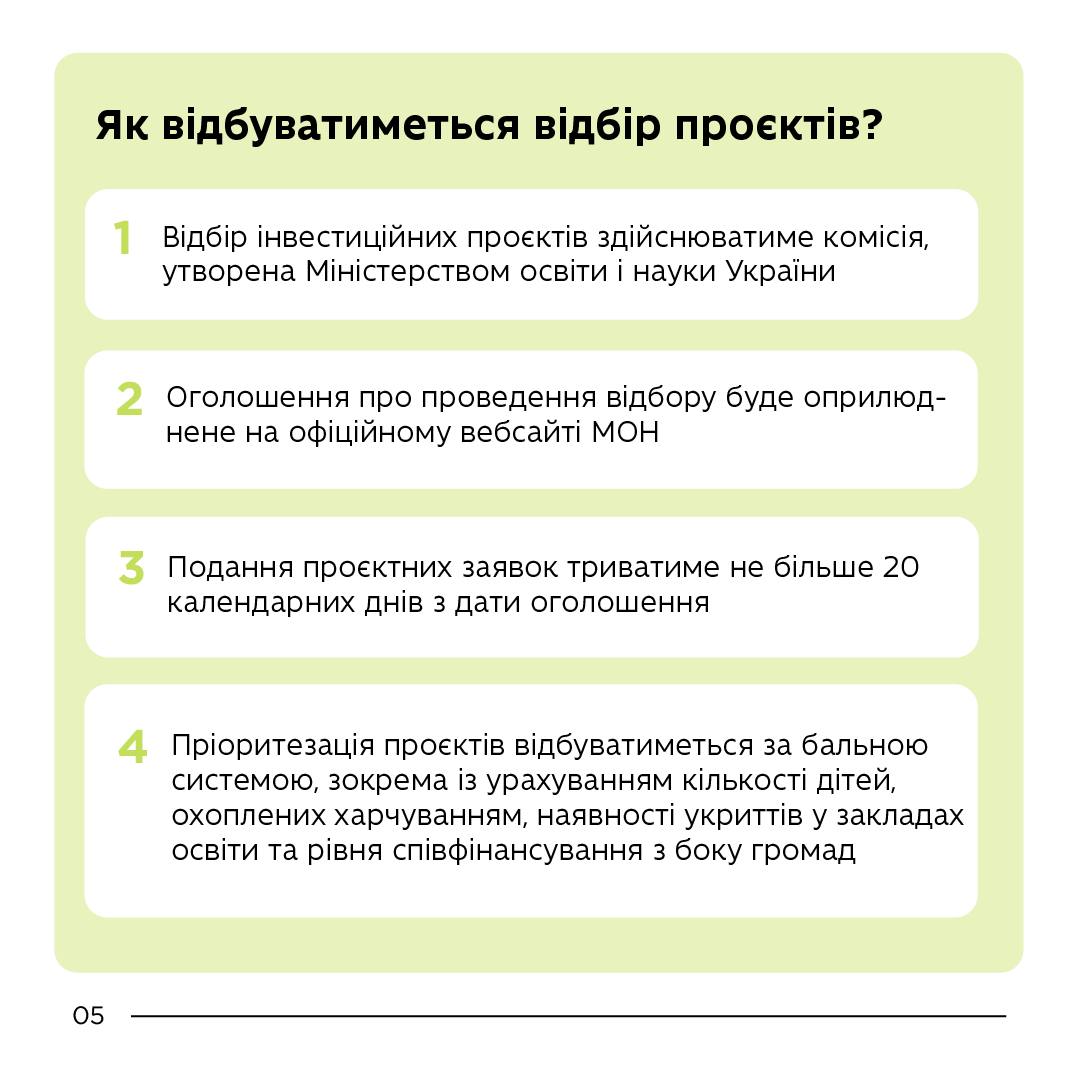 Відбір інвестиційних проєктів здійснюватиме комісія, утворена Міністерством освіти і науки України. Оголошення про проведення відбору буде оприлюднене на офіційному вебсайті МОН. Подання проєктних заявок триватиме не більше 20 календарних днів з дати оголошення. Пріоритезація проєктів відбуватиметься за бальною системою, зокрема із урахуванням кількості дітей, охоплених харчуванням, наявності укриттів у закладах освіти та рівня співфінансування з боку громад.
